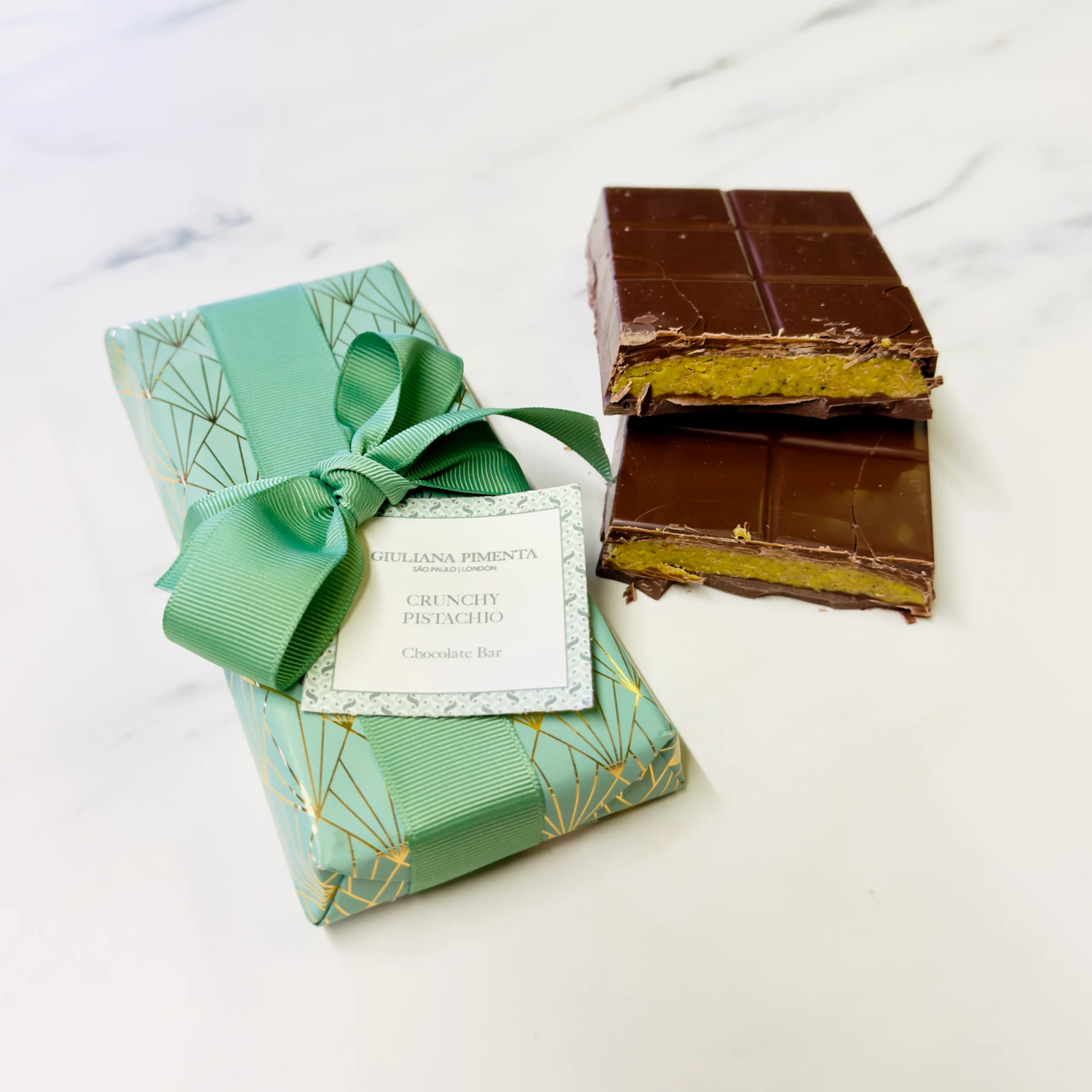 Experimente la armonía perfecta de texturas y sabores en nuestro Barrita de chocolate con pistacho crujiente. Fabricado con rico chocolate con leche 41% y profusamente lleno de ganache crujiente de pistacho, Elaborado con pistachos tostados y barquillo caramelizado para darle profundidad, textura crujiente y autenticidad.
