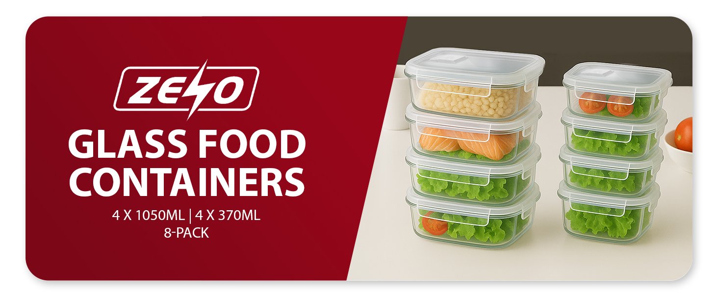 ZENO Envases de Vidrio con Tapa 8 Pack | Envases para Comida Preparada | Envase de Vidrio para Comida con Tapa, Cierre Hermético, Tapa a Prueba de Fugas | Apto para Lavavajillas | Apto para Congelador y Microondas | 4 X 1050ml + 4 X 370ml